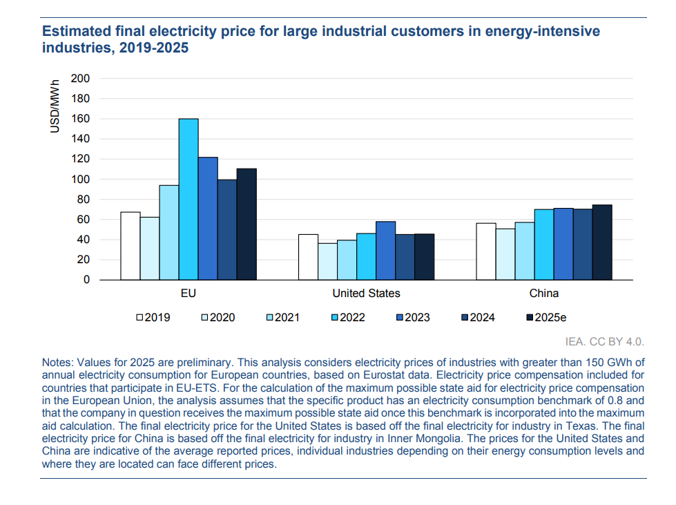能源密集型產(chǎn)業(yè)的電價(jià)在各地區(qū)仍存在顯著差異。歐盟電價(jià)從2022年的峰值持續(xù)下降,但預(yù)計(jì)2025年將同比上漲,這主要是由于批發(fā)價(jià)格水平的提高。2025年歐盟的平均電價(jià)預(yù)計(jì)約為美國的兩倍,比中國高出約50%。相比之下,2019年歐盟的電價(jià)約為美國的1.5倍,比中國高出約20%。