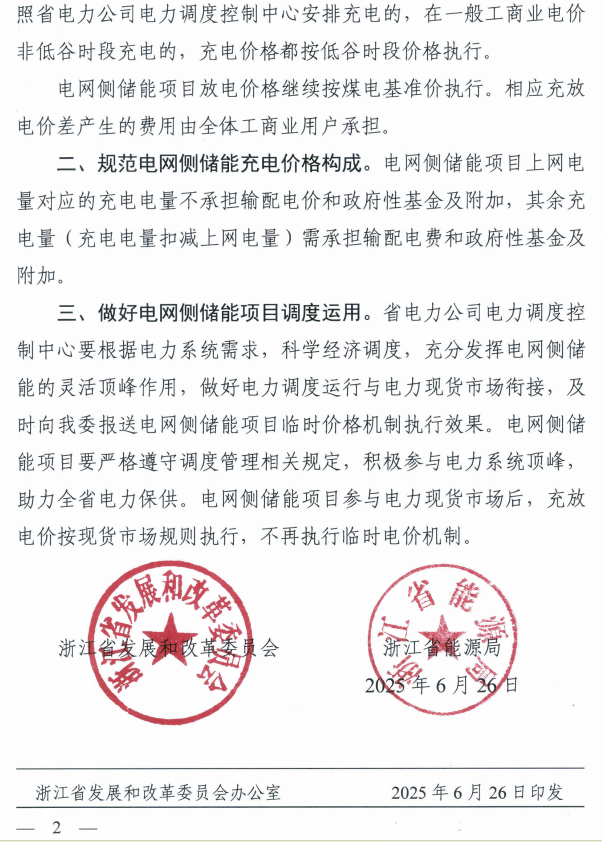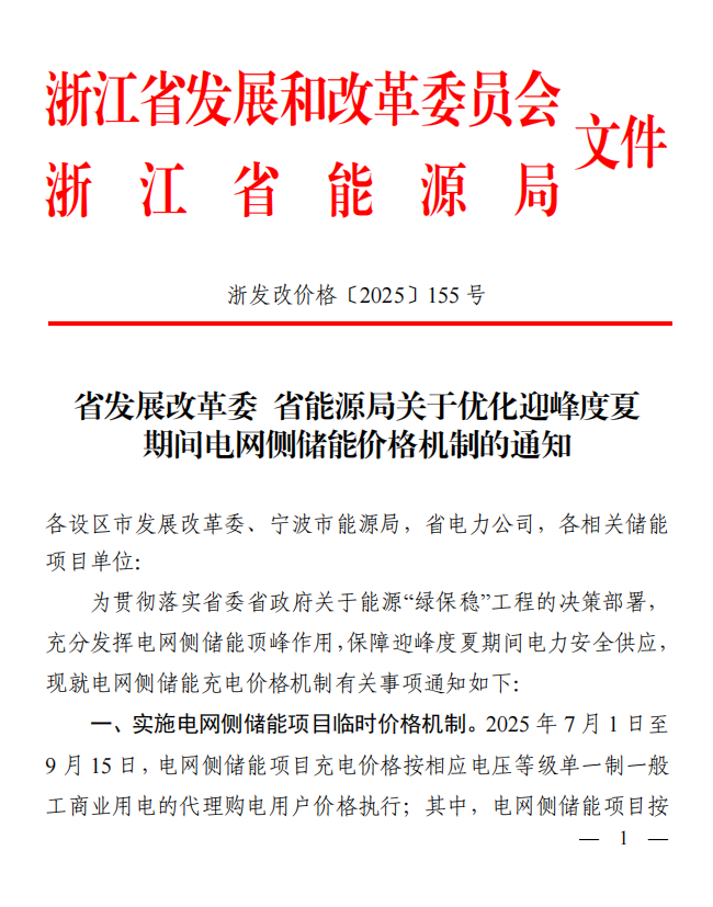 中國儲能網(wǎng)訊:8月13日,浙江省發(fā)改委發(fā)布《省發(fā)展改革委省能源局關于優(yōu)化迎峰度夏期間電網(wǎng)側(cè)儲能價格機制的通知》。其中提出,2025年7月1日至9月15日,電網(wǎng)側(cè)儲能項目充電價格按相應電壓等級單一制一般工商業(yè)用電的代理購電用戶價格執(zhí)行;在?般工商業(yè)電價非低谷時段充電的,充電價格都按低谷時段價格執(zhí)行。