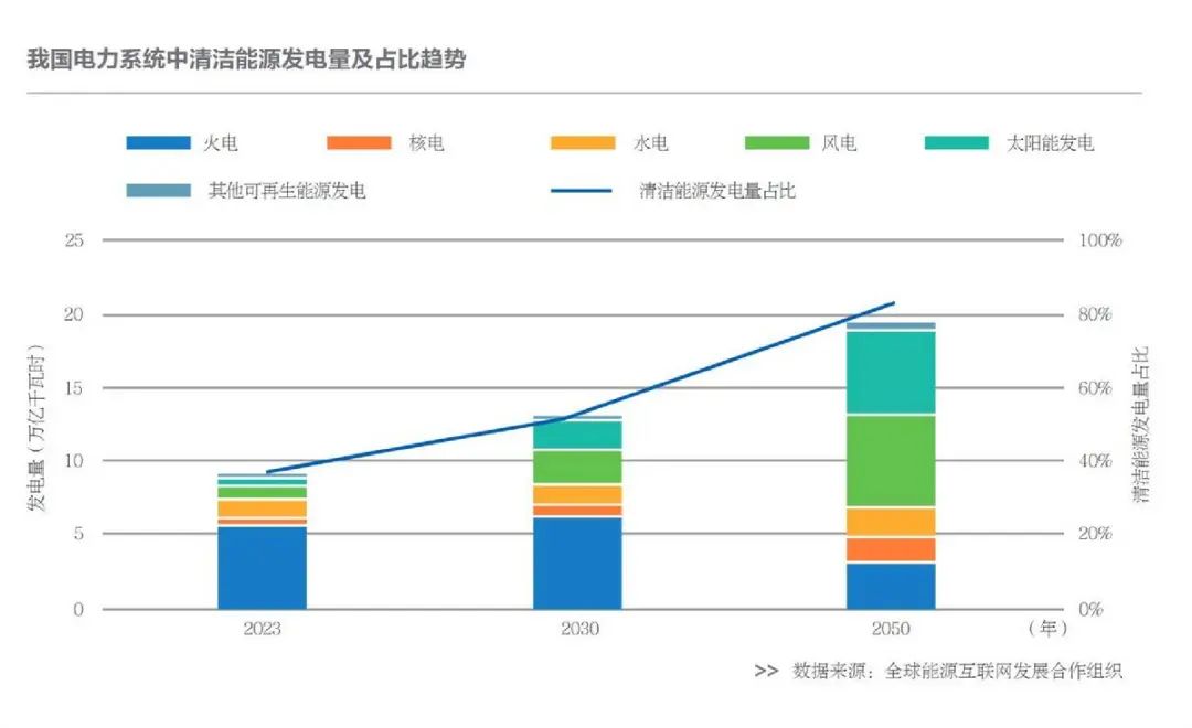 從負(fù)荷側(cè)來(lái)看,2024年我國(guó)全社會(huì)用電量達(dá)9.85萬(wàn)億千瓦時(shí)。預(yù)計(jì)“十五五”期間,電力需求增速仍將高于經(jīng)濟(jì)增速,電力負(fù)荷增長(zhǎng)顯著高于用電量增長(zhǎng)。電動(dòng)汽車(chē)、數(shù)字基礎(chǔ)設(shè)施、可再生能源制氫、電制燃料原材料等新型用電領(lǐng)域成為用電需求增長(zhǎng)的新動(dòng)能。預(yù)計(jì)到2030、2050年,全社會(huì)用電量將分別達(dá)到13.2萬(wàn)億千瓦時(shí)和19.5萬(wàn)億千瓦時(shí),終端用能的電氣化率則提升至35%和66%。