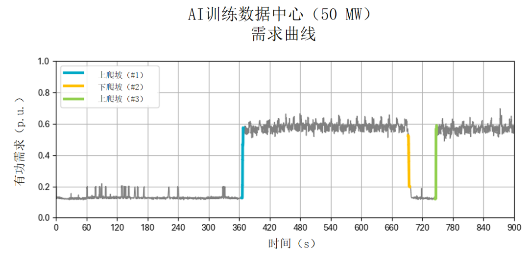 2025年7月,北美電力可靠性公司(NERC)發(fā)布了其大型負荷工作組首份白皮書[1],該白皮書提到,加拿大電力設備供應商Edge Tune Power公司通過高速記錄儀采集了AI模型訓練與推理應用的電力需求(圖1)。數(shù)據(jù)顯示,在快速爬坡階段,負荷以每秒1.9標幺值(p.u.)的速率持續(xù)變化約250毫秒。訓練過程中會出現(xiàn)高頻抖動型尖峰(圖1中360-660秒?yún)^(qū)間)。此類劇變既出現(xiàn)在“空閑與峰值利用率”狀態(tài)切換時,也發(fā)生于“工作負荷正常運行期間”,主要歸因于訓練步驟中計算密集型與網(wǎng)絡密集型階段的交替出現(xiàn)[2]。