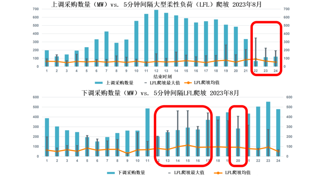 2023年8月,得克薩斯州電力可靠性委員會(ERCOT)的系統(tǒng)運行數(shù)據(jù)為行業(yè)提供了警示案例[3]。大型柔性負荷(Large Flexible Load,LFL)在深夜時段的上調(diào)爬坡最大需求超出了當時系統(tǒng)運營商采購的上調(diào)資源數(shù)量。其中,22時觀測到的實際爬坡最大值達到當前上調(diào)采購數(shù)量的4倍之多。在正午至傍晚時段(12時-17時),下調(diào)爬坡需求也多次超出采購的下調(diào)數(shù)量。