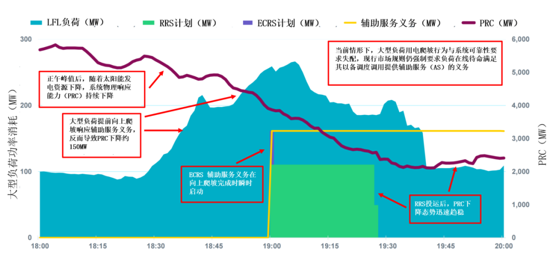 2023年9月6日傍晚,得州ERCOT電網(wǎng)進入緊急能源警報(EEA)狀態(tài)(圖4)。其核心原因之一是:大型柔性負荷為履行其輔助服務義務,在系統(tǒng)物理響應能力(PRC)不足時段反而快速拉升“出力”。負荷拉升與太陽能出力下降相疊加,導致系統(tǒng)可調(diào)容量PRC驟降并接近警戒水平。最終,ERCOT被迫緊急調(diào)用響應式備用服務(RRS)才挽回PRC下降趨勢。