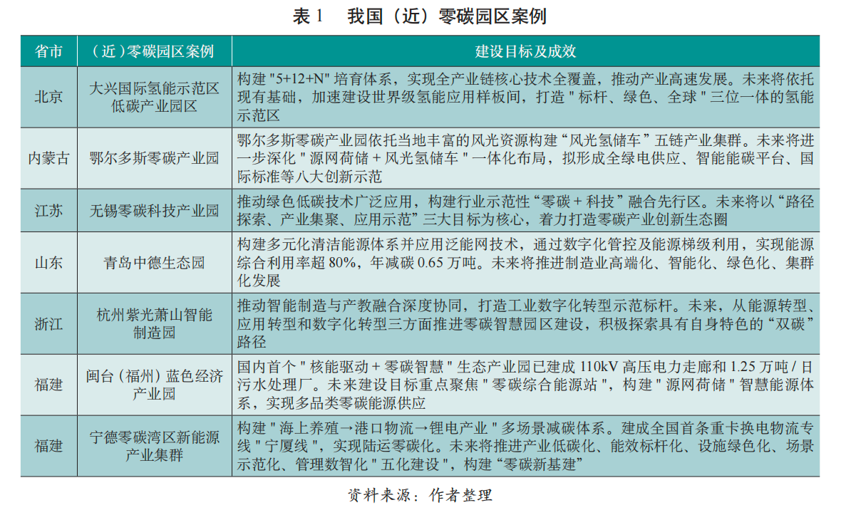 2020年隨著我國“雙碳”目標的提出,零碳園區(qū)建設(shè)從理念轉(zhuǎn)向?qū)嵺`。2021年,國務(wù)院印發(fā)《2030年前碳達峰行動方案》首次明確園區(qū)低碳轉(zhuǎn)型方向;2022年,科技部印發(fā)《“十四五”國家高新技術(shù)產(chǎn)業(yè)開發(fā)區(qū)發(fā)展規(guī)劃》,進一步鼓勵建設(shè)低碳產(chǎn)業(yè)園區(qū),推動綠色技術(shù)與低碳產(chǎn)業(yè)深度融合。在政策引導(dǎo)下,全國多地發(fā)布(近)零碳園區(qū)建設(shè)指南并積極推進試點工作(見表1)。典型案例包括鄂爾多斯零碳產(chǎn)業(yè)園,其“風(fēng)光氫儲車”一體化系統(tǒng)實現(xiàn)80%綠電直供,吸引多家頭部企業(yè)入駐;北京大興國際氫能示范區(qū)全面向全球引入氫能創(chuàng)新產(chǎn)業(yè),打造具有國際影響力的氫能科技成果轉(zhuǎn)化示范基地。