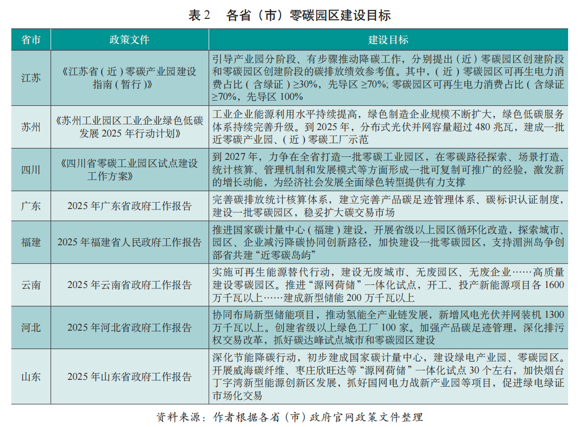 作為零碳園區(qū)建設(shè)的“政策元年”,2025年全國“兩會”上明確提出構(gòu)建“能源零碳化、產(chǎn)業(yè)低碳化、管理數(shù)智化”的總體框架,出臺零碳園區(qū)建設(shè)方案,推進零碳園區(qū)、社區(qū)、鄉(xiāng)村同步發(fā)展。《零碳園區(qū)評價技術(shù)規(guī)范》(T/CECA-G 0344-2025)同期發(fā)布,首次提出涵蓋碳核算、清潔能源比例、循環(huán)經(jīng)濟等七大維度的評價體系,標志著園區(qū)建設(shè)進入精細化治理階段。各地政府積極響應(yīng),結(jié)合區(qū)域特色推進轉(zhuǎn)型升級(見表2)。