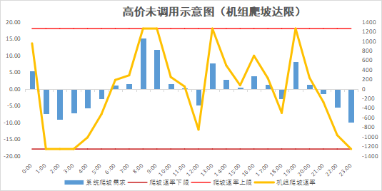 典型案例:7月24日日前市場,晚高峰時段某電廠#1套機節(jié)點電價高于申報價格,但機組出清負荷低于對應申報價格的負荷段出力。其原因一般為兩種情況,第一種是受自身調節(jié)特性影響,在系統(tǒng)負荷需求變化較快的時間段,機組響應系統(tǒng)爬坡需求,當機組達到爬坡速率限值時,機組在相應的時段內(nèi)無可用爬坡能力,無法滿足系統(tǒng)需求,不參與市場定價,只能作為市場價格接受者,因此出現(xiàn)高價未調用情況。