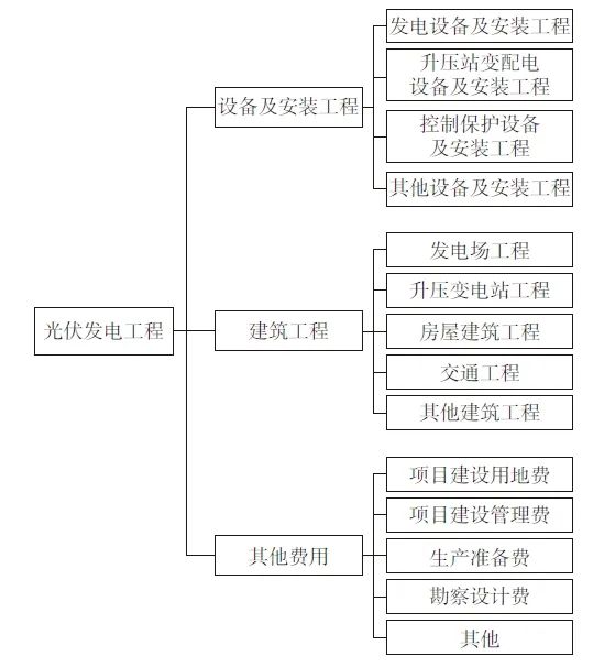 目前交能融合項目主要利用分布式光伏進(jìn)行發(fā)電,同時可以加以配套充電樁、儲能和分布式風(fēng)機(jī)等裝置。投資估算依照《光伏發(fā)電工程設(shè)計概算編制規(guī)定及費(fèi)用標(biāo)準(zhǔn)》(NB/T32027—2016),包括項目劃分及費(fèi)用構(gòu)成等,具體如下圖所示。
