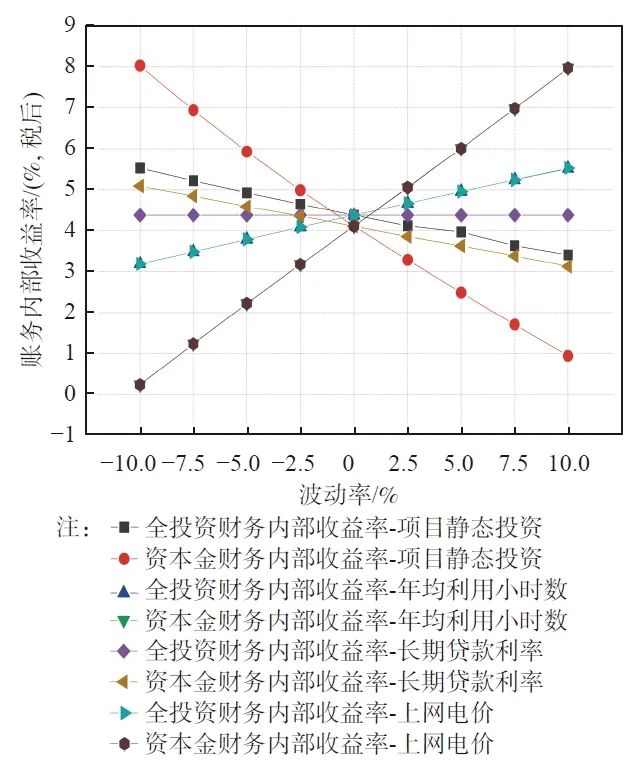 考慮到當(dāng)前選用經(jīng)濟(jì)評價的部分重要參數(shù)存在不確定性,具有一定風(fēng)險。因此本文以主方案為例,選取項目靜態(tài)投資、年均利用小時數(shù)、長期貸款利率、上網(wǎng)電價、自用電比例等參數(shù)進(jìn)行敏感性分析,結(jié)果如下圖所示。