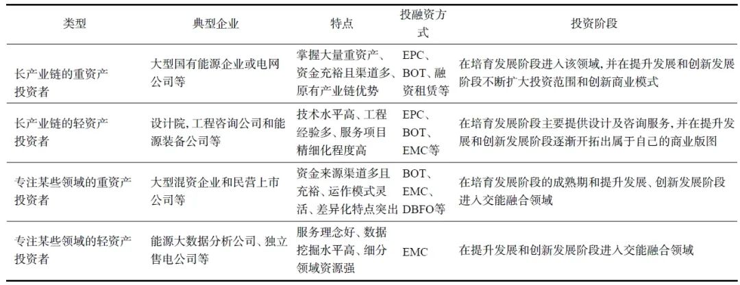 本文基于資產(chǎn)結(jié)構(gòu)和產(chǎn)業(yè)鏈延伸度將交能融合項目的投資者分為長產(chǎn)業(yè)鏈的重資產(chǎn)投資者、長產(chǎn)業(yè)鏈的輕資產(chǎn)投資者、專注某些領(lǐng)域的重資產(chǎn)投資者、專注某些領(lǐng)域的輕資產(chǎn)投資者。不同類型的投資者具有相應(yīng)的特點(diǎn)和投融資方式,并在不同發(fā)展階段進(jìn)入交能融合領(lǐng)域,具體如下表所示。