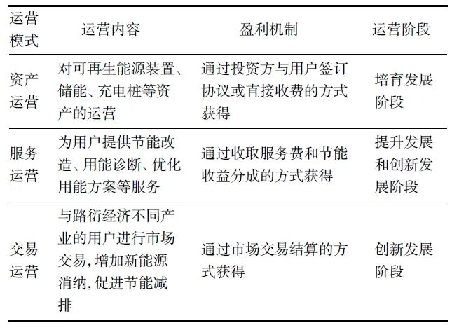 根據(jù)交能融合項目運(yùn)營內(nèi)容的不同,分為資產(chǎn)運(yùn)營及盈利機(jī)制、服務(wù)運(yùn)營及盈利機(jī)制和交易運(yùn)營及盈利機(jī)制。交能融合商業(yè)模式不同發(fā)展階段的運(yùn)營方式及利益來源如下表所示: