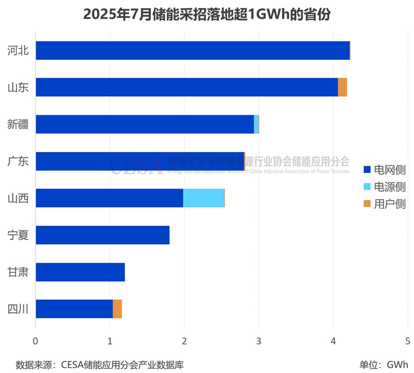 從區(qū)域分布上來看,7月河北、山東儲(chǔ)能采招落地規(guī)模均超過4GWh,領(lǐng)跑全國。