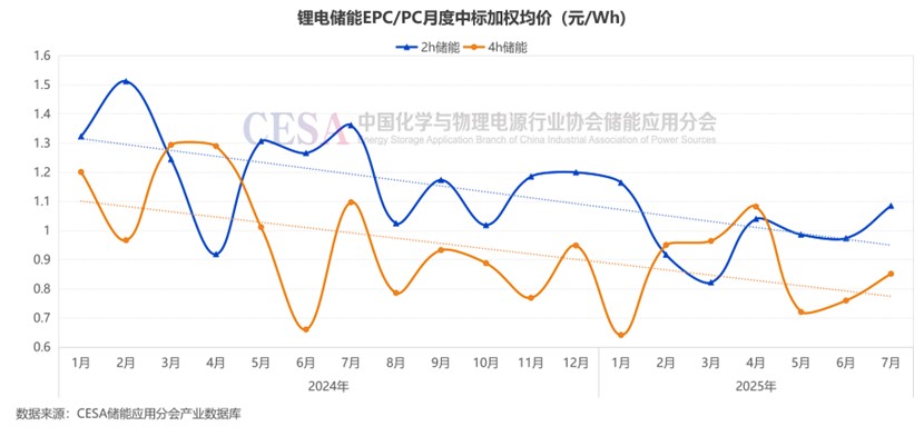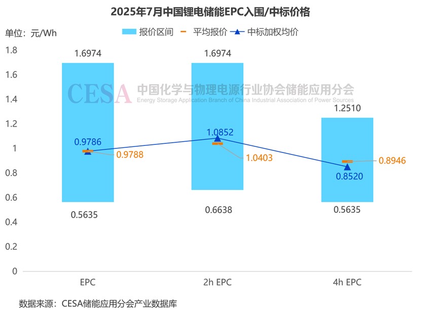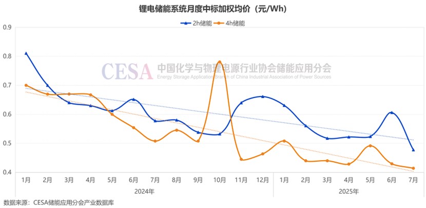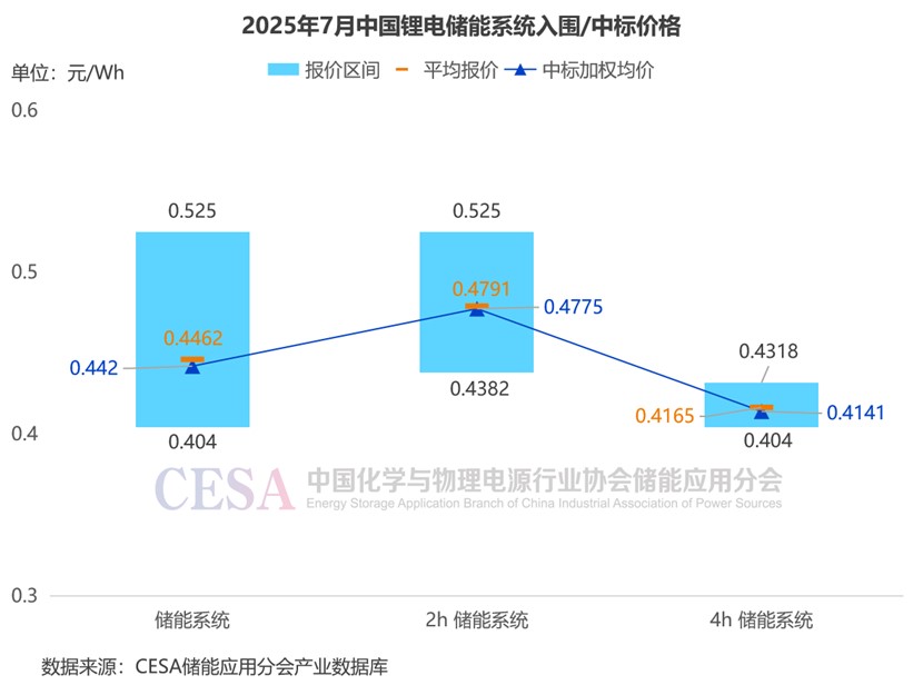 7月4h鋰電儲(chǔ)能系統(tǒng)入圍報(bào)價(jià)主要集中在0.404-0.4318元/Wh,平均報(bào)價(jià)0.4165元/Wh,中標(biāo)加權(quán)均價(jià)0.4141元/Wh,創(chuàng)4h鋰電儲(chǔ)能系統(tǒng)月度均價(jià)最低。最低報(bào)價(jià)來自于國華投資國能蒙東莫旗風(fēng)電基地項(xiàng)目儲(chǔ)能設(shè)備采購,中車株洲所以0.404元/Wh的報(bào)價(jià)入圍成為第二中標(biāo)候選人,創(chuàng)當(dāng)時(shí)入圍最低價(jià)新低,直至這個(gè)紀(jì)錄在2025年8月在中國能建2025年度磷酸鐵鋰電池儲(chǔ)能系統(tǒng)集中采購項(xiàng)目中,被安誠新能源、鵬程無限、晶科能源、平高儲(chǔ)能、同啟新能源、精控能源等企業(yè)≤0.4元/Wh的入圍報(bào)價(jià)打破。