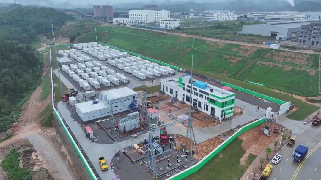 航拍鏡頭下,一排排白色的集裝箱式儲(chǔ)能裝置整齊排列,施工人員正在緊張有序地進(jìn)行電氣設(shè)備安裝和電纜鋪設(shè)工作。