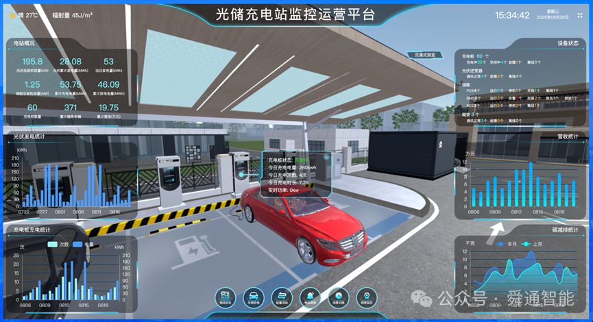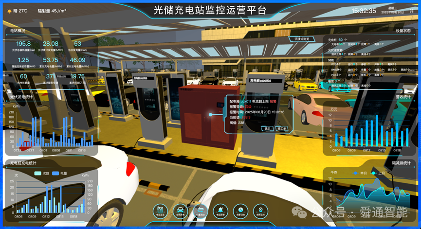 舜通光儲(chǔ)充數(shù)字孿生管理平臺(tái),核心是“物理場(chǎng)景數(shù)字化映射 + 全流程智能管控”。我們經(jīng)現(xiàn)場(chǎng)勘查、無(wú)人機(jī)航拍、數(shù)據(jù)采集等前期準(zhǔn)備,通過(guò)建模、3D可視化開(kāi)發(fā)、數(shù)據(jù)處理,用數(shù)字孿生3D可視化技術(shù)1:1還原現(xiàn)場(chǎng)布局與設(shè)備狀態(tài),構(gòu)建“實(shí)時(shí)采集 - 動(dòng)態(tài)反饋 - 智能決策”閉環(huán)。平臺(tái)接入光伏、儲(chǔ)能、充電關(guān)鍵數(shù)據(jù),經(jīng)算法優(yōu)化轉(zhuǎn)換效率、存儲(chǔ)策略與負(fù)荷分配,實(shí)現(xiàn)全鏈條精準(zhǔn)調(diào)控,兼顧高效、穩(wěn)定與安全。
