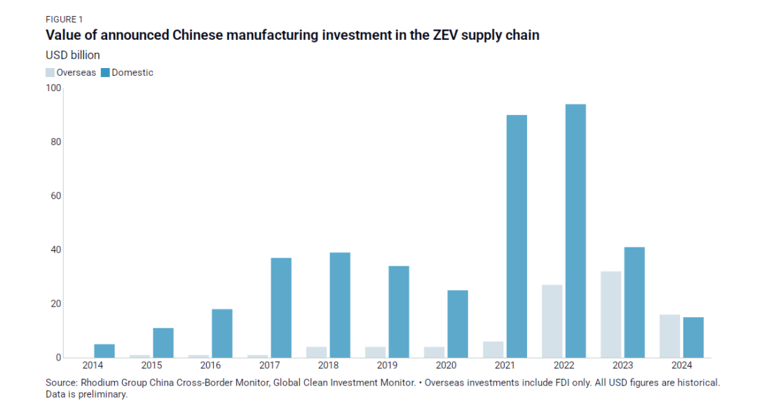 近日,咨詢公司榮鼎集團(tuán)(Rhodium Group)發(fā)布一份研究報(bào)告顯示,2024年,中國(guó)電動(dòng)汽車產(chǎn)業(yè)鏈企業(yè)海外投資約為160億美元,略高于國(guó)內(nèi)150億美元的投資規(guī)模。這也是自2014年有記錄以來(lái),中國(guó)電動(dòng)汽車產(chǎn)業(yè)鏈企業(yè)的海外投資首次超過(guò)國(guó)內(nèi)投資。