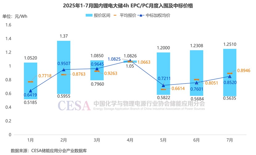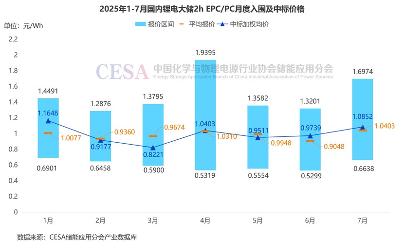據(jù)CESA儲能應(yīng)用分會產(chǎn)業(yè)數(shù)據(jù)庫不完全統(tǒng)計,2025年1-7月,鋰電儲能EPC/PC采招落地項目入圍報價主要集中在0.5172-1.9395元/Wh區(qū)間內(nèi),平均報價1.006元/Wh,中標(biāo)加權(quán)均價0.9753元/Wh。