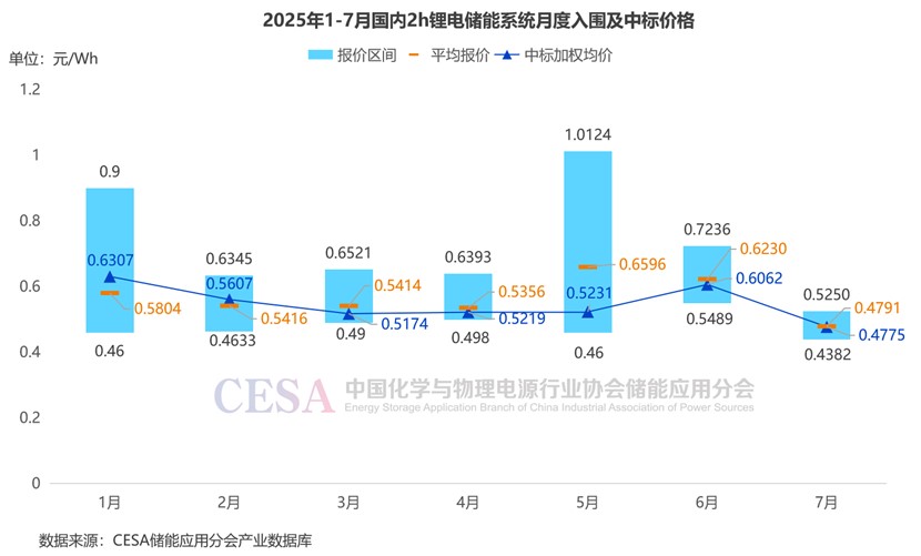 據(jù)CESA儲能應(yīng)用分會產(chǎn)業(yè)數(shù)據(jù)庫不完全統(tǒng)計,2025年1-7月,鋰電儲能系統(tǒng)(不含工商業(yè)儲能柜)采招落地項目入圍報價主要集中在0.404-1.0124元/Wh區(qū)間內(nèi),平均報價0.5327元/Wh,中標(biāo)加權(quán)均價0.4849元/Wh。