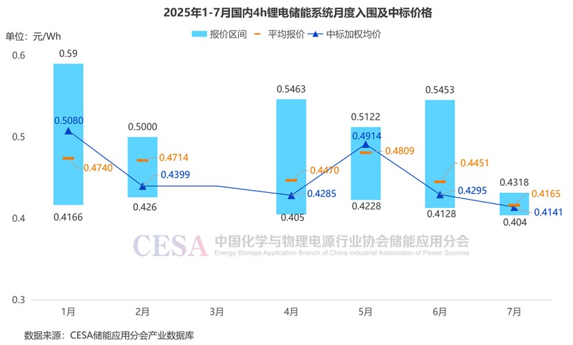 2025年1-7月,4h鋰電儲能系統(tǒng)(不含工商業(yè)儲能柜)采招落地項目入圍報價主要集中在0.404-0.59元/Wh范圍內(nèi),平均報價0.4577元/Wh,中標(biāo)加權(quán)均價0.4414元/Wh。最低入圍報價來自于國華投資國能蒙東莫旗風(fēng)電基地項目儲能設(shè)備采購,7月中車株洲所以14544萬元的投標(biāo)報價入圍成為第二中標(biāo)候選人,折合單價0.404元/Wh。