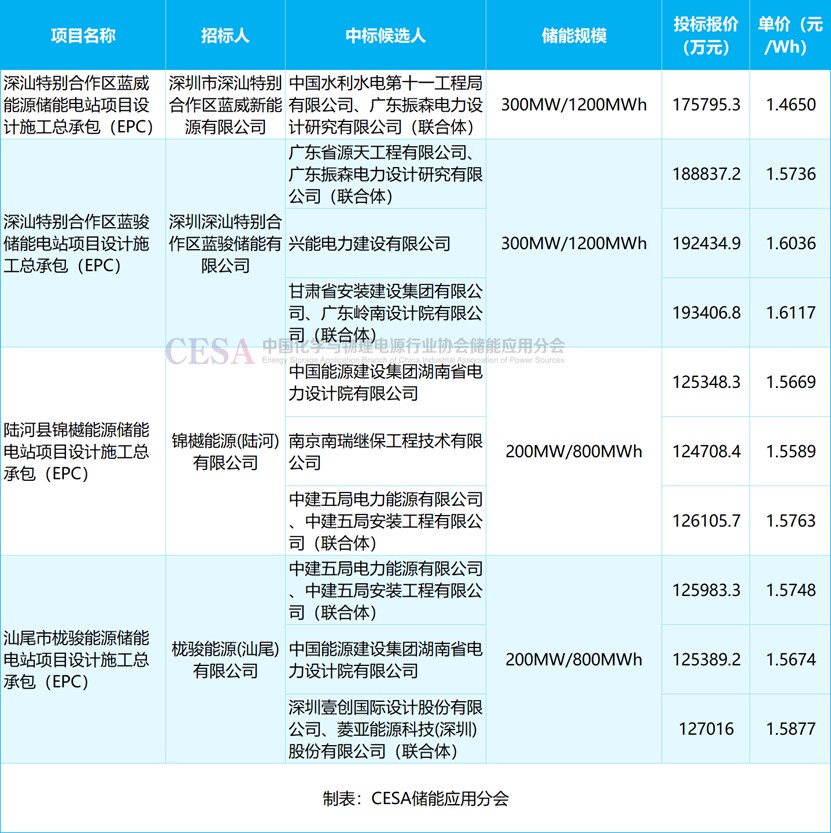 最低報價來自于深汕特別合作區(qū)藍威能源儲能電站項目設(shè)計施工總承包(EPC),2025年5月,中國水利水電第十一工程局有限公司、廣東振森電力設(shè)計研究有限公司以175795.3412萬元的報價中標(biāo),折合單價1.465元/Wh。
