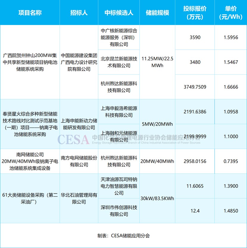 表 2025年1-7月鈉離子電池儲能系統(tǒng)采招落地項目報價