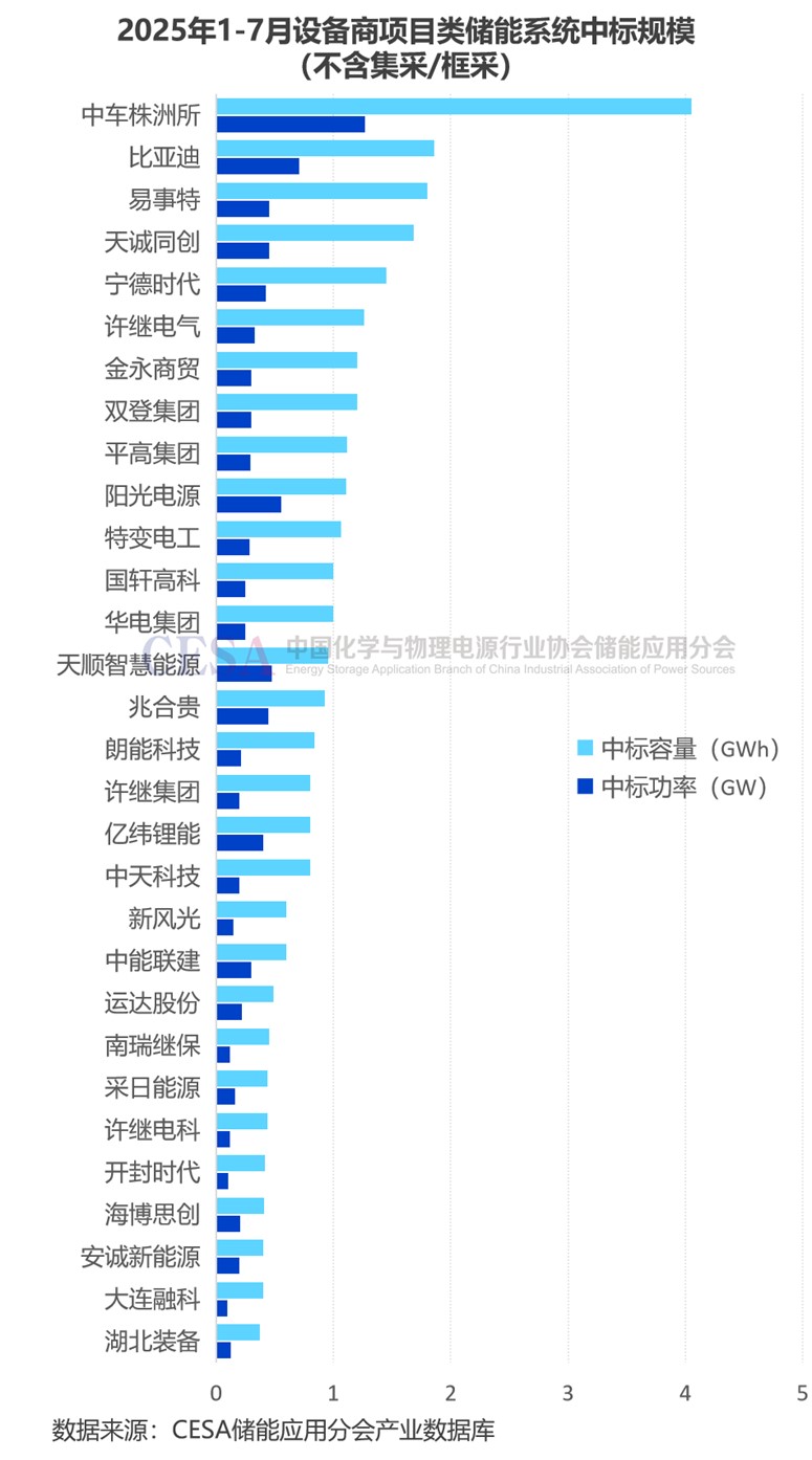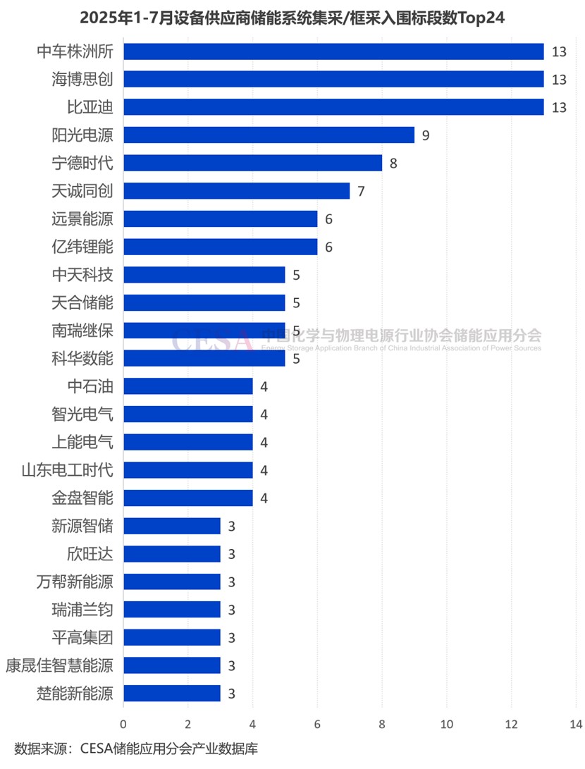 2025年1-7月儲能系統(tǒng)(含直流側(cè))集采/框采入圍標(biāo)段數(shù)量最多的是比亞迪、海博思創(chuàng)、中車株洲所,均達到13個。