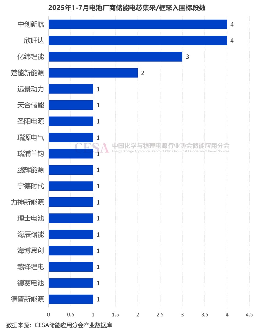 2025年1-7月儲能電芯集采/框采落地總規(guī)模達7.8GWh,入圍標(biāo)段數(shù)量最多的是中創(chuàng)新航和欣旺達,均達到4個。億緯鋰能3個,楚能新能源2個。