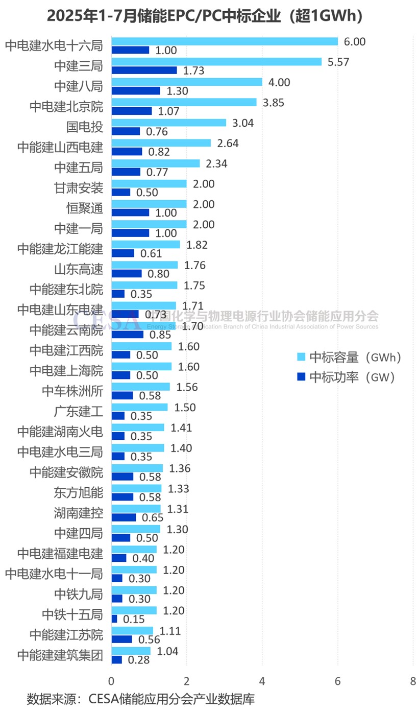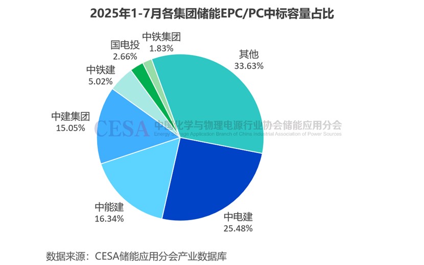 從集團層面分析,2025年1-7月,中電建儲能EPC/PC中標(biāo)規(guī)模最大,達8.84GW/29.13GWh,容量占比25.48%。