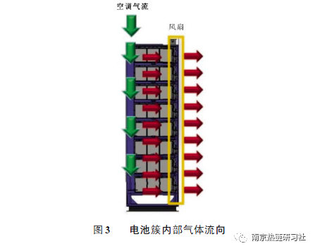 圖3所示為電池簇內(nèi)部氣體流向,空調(diào)輸出的氣流經(jīng)風(fēng)道出口以一定的速度向下流出后,在電池模塊前端面板風(fēng)扇的作用下,從電池模塊后端面板進(jìn)風(fēng)口進(jìn)入電池模塊內(nèi)部,流經(jīng)電池單體表面對電池單體降溫,然后由風(fēng)扇抽出。
