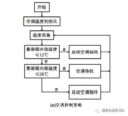 空調(diào)控制由空調(diào)自身邏輯控制來實現(xiàn),根據(jù)集裝箱內(nèi)部不同溫度條件可分為制熱模式和制冷模式,制熱模式實現(xiàn)對電池低溫下的控制和保護(hù),制冷模式實現(xiàn)對電池溫升的有效控制。當(dāng)集裝箱內(nèi)部溫度低于12℃時,空調(diào)制熱功能開啟;當(dāng)集裝箱內(nèi)部溫度高于28℃時,空調(diào)制冷功能開啟。