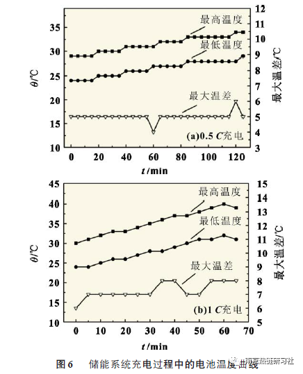 研究結(jié)果表明,采用設(shè)計的熱管理系統(tǒng)及溫控策略,可以保證儲能系統(tǒng)0.5C充電運行時,電池最高溫度不高于34℃,儲能系統(tǒng)最大溫差基本保持在5℃,說明儲能系統(tǒng)低倍率運行時,可以保證電池工作在最佳溫度范圍內(nèi)。儲能系統(tǒng)1C充電運行時,電池最高溫度不超過40℃,儲能系統(tǒng)最大溫差8℃以內(nèi),熱管理效果良好。
