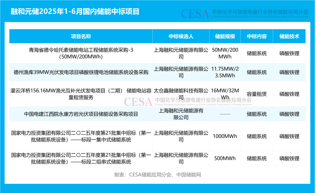 從訂單表現(xiàn)來看,2025年1—6月融和元儲在國內(nèi)儲能招標(biāo)中表現(xiàn)活躍,累計(jì)參與超10個(gè)項(xiàng)目,涵蓋電網(wǎng)側(cè)獨(dú)立儲能、電源側(cè)光伏配儲、用戶側(cè)工商業(yè)儲能及集采框架四大領(lǐng)域。作為第1中標(biāo)候選人,其先后中標(biāo)青海德令哈(50MW/200MWh,9220萬元)、德州漁庫(11.75MW/23.5MWh,1574.5萬元)等項(xiàng)目,并在國家電投首批儲能集采中斬獲組串式標(biāo)段500MWh訂單(23575萬元),顯示出較強(qiáng)的市場競爭力。