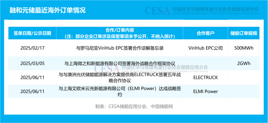 針對海外市場融和元儲的拓展成效同樣顯著,先后與羅馬尼亞ViriHub EPC、澳洲ELECTRUCK等國際能源企業(yè)達(dá)成深度合作。2月與羅馬尼亞企業(yè)簽署500MWh儲能系統(tǒng)合作諒解備忘錄,開啟歐洲市場布局;6月與澳洲光伏儲能解決方案商ELECTRUCK簽訂五年戰(zhàn)略合作協(xié)議,鎖定長期訂單需求;同期,與上海微之和新能源有限公司簽署2GWh海外戰(zhàn)略合作框架協(xié)議,并完成與ELMI Power的戰(zhàn)略簽約,進(jìn)一步強(qiáng)化技術(shù)協(xié)同與市場資源整合。