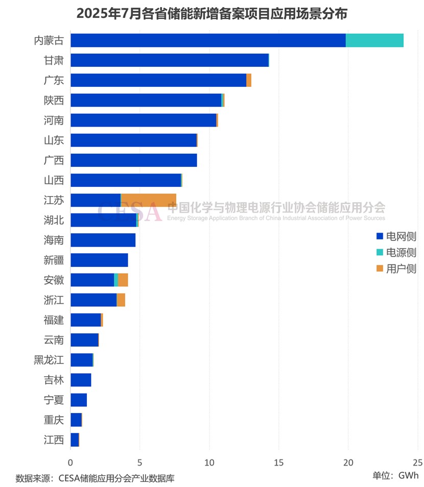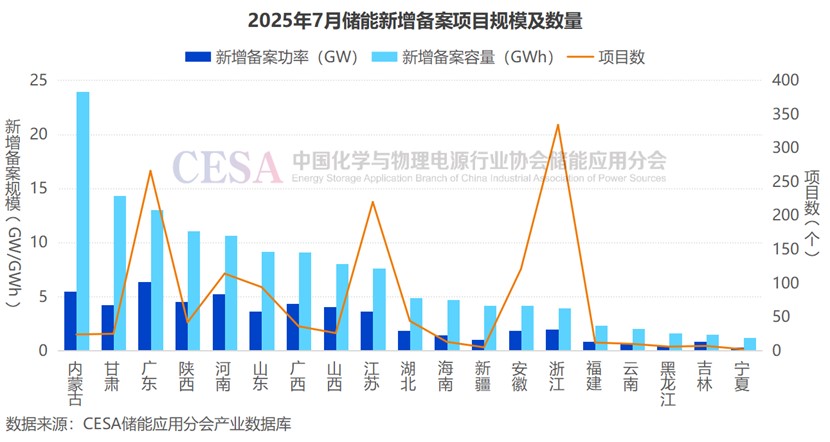 2025年7月,國內(nèi)共新增備案28個(gè)GWh級(jí)儲(chǔ)能項(xiàng)目,其中內(nèi)蒙古獨(dú)占12個(gè),成為絕對(duì)主力;此外,甘肅4個(gè),山西、山東、廣西各2個(gè)。