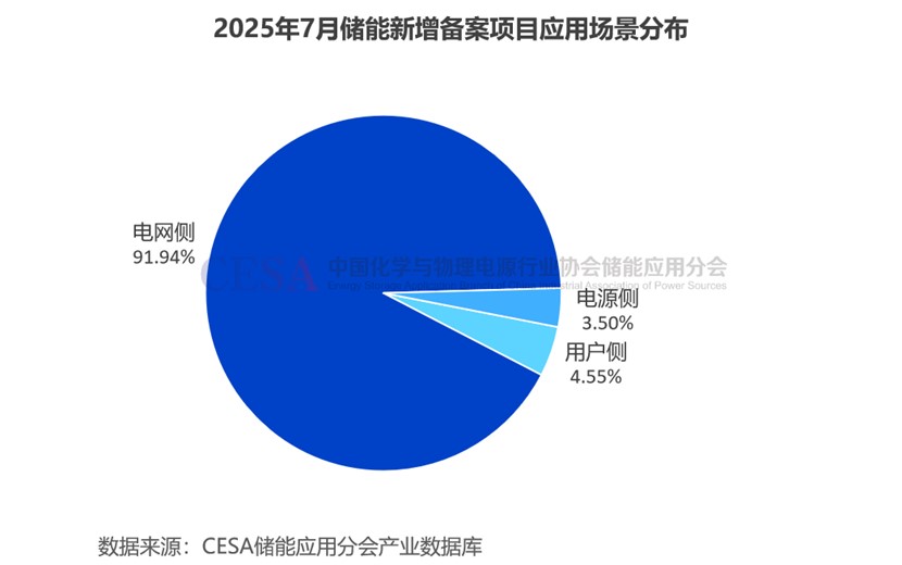 據(jù)CESA儲(chǔ)能應(yīng)用分會(huì)產(chǎn)業(yè)數(shù)據(jù)庫不完全統(tǒng)計(jì),2025年7月,國內(nèi)電網(wǎng)側(cè)儲(chǔ)能新增備案已披露規(guī)模49.19GW/128.37GWh,占比91.44%(功率)/91.94%(容量);電源側(cè)儲(chǔ)能新增備案1.44GW/4.89GWh,占比2.68%(功率)/3.50%(容量);用戶側(cè)儲(chǔ)能新增已披露規(guī)模2.96GW/6.36GWh,占比5.50%(功率)/4.55%(容量)。