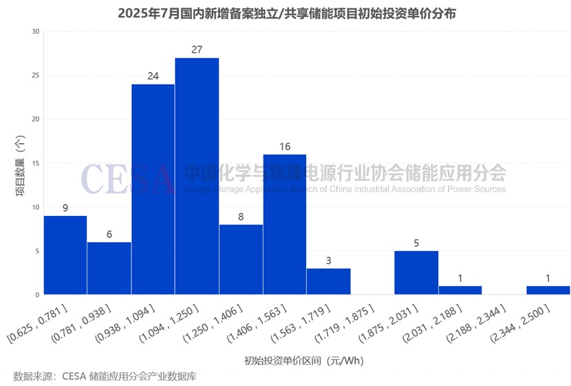 據(jù)CESA儲(chǔ)能應(yīng)用分會(huì)產(chǎn)業(yè)數(shù)據(jù)庫不完全統(tǒng)計(jì),2025年7月,國內(nèi)共新增備案了271個(gè)獨(dú)立/共享儲(chǔ)能項(xiàng)目,其中鋰電獨(dú)立/共享儲(chǔ)能(不包括含鋰電池的混合儲(chǔ)能)項(xiàng)目共236個(gè),其中100個(gè)項(xiàng)目披露了初始投資單價(jià),在0.625-2.5元/Wh區(qū)間內(nèi),平均初始投資單價(jià)1.227元/Wh。