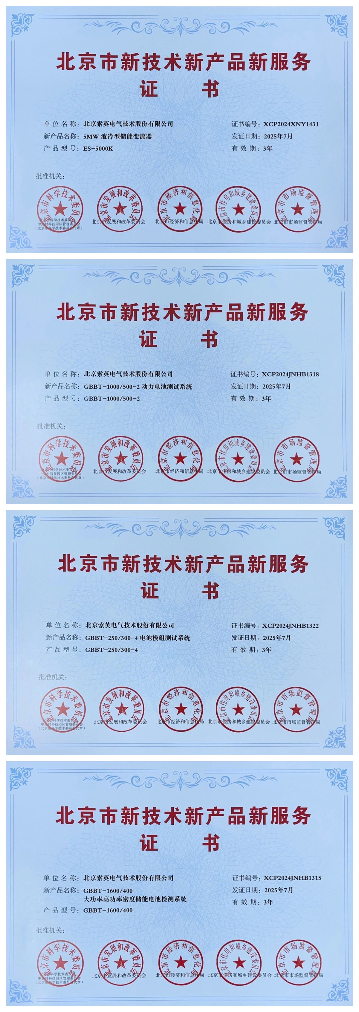 中國(guó)儲(chǔ)能網(wǎng)訊:近日,索英電氣的5MW液冷型儲(chǔ)能變流器、動(dòng)力電池測(cè)試系統(tǒng)、電池模組測(cè)試系統(tǒng)及大功率高功率密度儲(chǔ)能電池檢測(cè)系統(tǒng),憑借其卓越的技術(shù)創(chuàng)新性與顯著的市場(chǎng)競(jìng)爭(zhēng)力,榮獲由北京市科學(xué)技術(shù)委員會(huì)、中關(guān)村科技園區(qū)管理委員會(huì)、北京市發(fā)展和改革委員會(huì)、北京市經(jīng)濟(jì)和信息化局、北京市住房和城鄉(xiāng)建設(shè)委員會(huì)、北京市市場(chǎng)監(jiān)督管理局等六部門(mén)聯(lián)合頒發(fā)的《北京市新技術(shù)新產(chǎn)品新服務(wù)》證書(shū)。