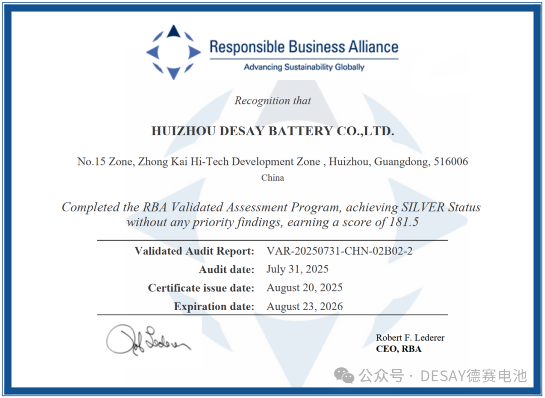 中國(guó)儲(chǔ)能網(wǎng)訊:在全球供應(yīng)鏈體系日益重視可持續(xù)發(fā)展與社會(huì)責(zé)任的今天,德賽電池積極融入國(guó)際標(biāo)準(zhǔn)體系,于2025年7月順利完成RBA(責(zé)任商業(yè)聯(lián)盟)VAP審核,并成功獲得白銀等級(jí)認(rèn)證。這一成果不僅標(biāo)志著公司在企業(yè)社會(huì)責(zé)任領(lǐng)域的堅(jiān)實(shí)進(jìn)步,也為構(gòu)建面向未來(lái)的競(jìng)爭(zhēng)力奠定了堅(jiān)實(shí)基礎(chǔ)。