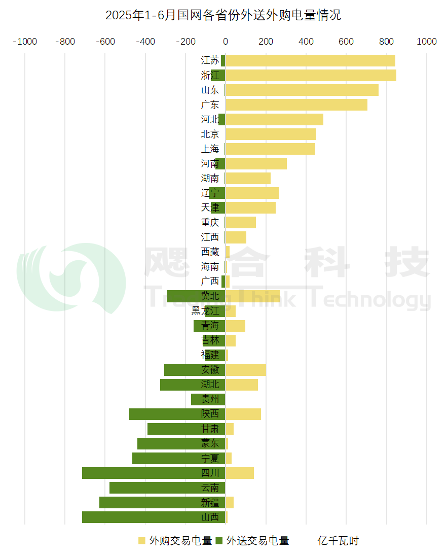 下圖的條形圖為2025年上半年各省份外送、外購電量情況,其中涉及南網(wǎng)區(qū)域的廣東、廣西、海南、云南、貴州5個省份采用南方區(qū)域電力交易中心披露的省間聯(lián)絡(luò)線輸電情況數(shù)據(jù)進(jìn)行統(tǒng)計。
