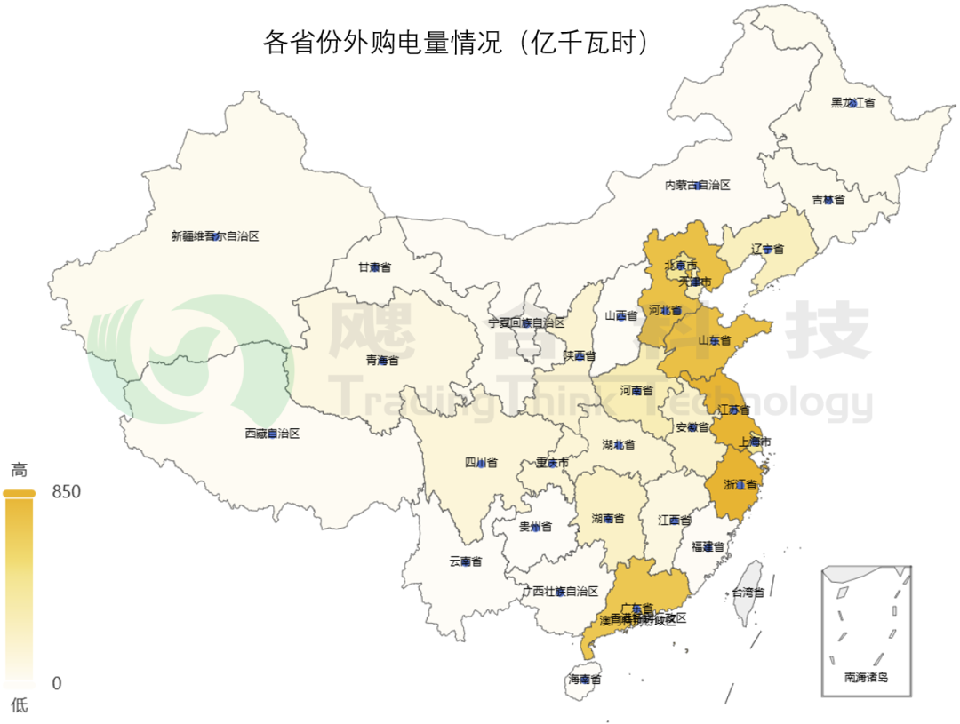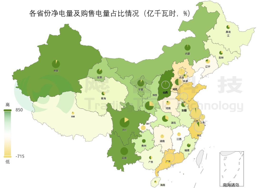 下圖為各省份外送電量減去外購電量的凈電量分布地圖,綠色深度表示外送電量總量大小,黃色深度表示外購電量總量大小。