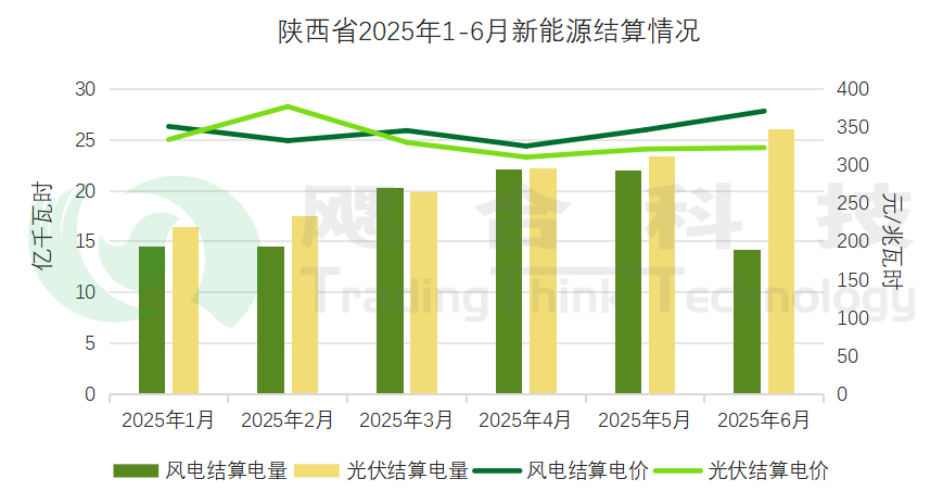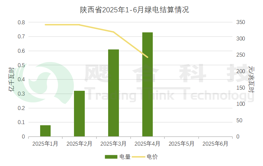 2025年1-4月陜西省結(jié)算綠電電量1.74億千瓦時,結(jié)算均價311.98元/兆瓦時,5、6月份綠電結(jié)算情況未披露。