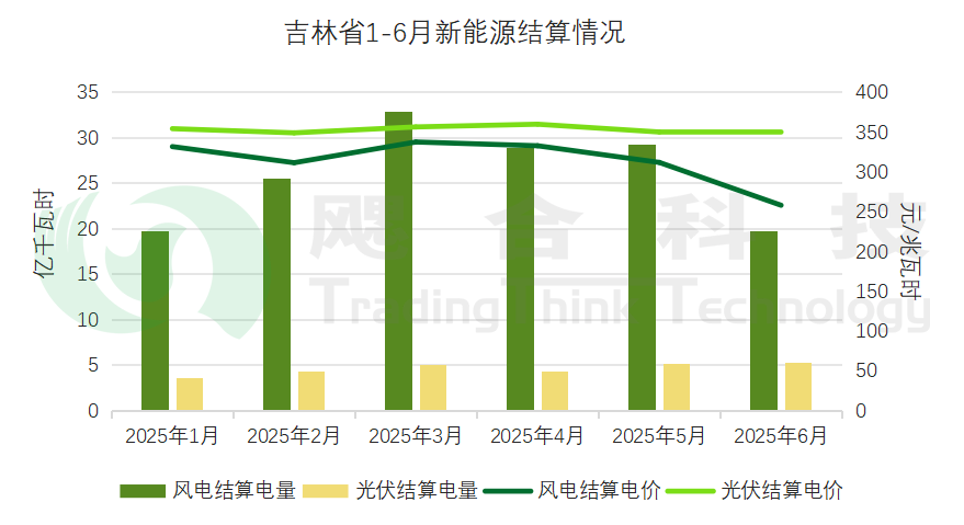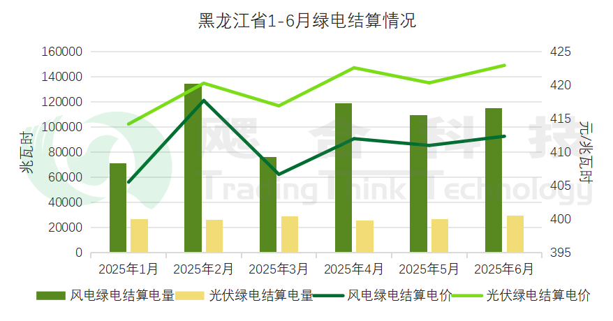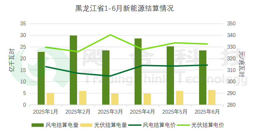黑龍江省2025年1-6月新能源總計結(jié)算電量為186億千瓦時,風(fēng)電1-6月結(jié)算均價為311元/兆瓦時,光伏1-6月結(jié)算均價為331元/兆瓦時。