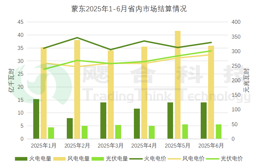 2025年1-6月,蒙東省內(nèi)市場累計結(jié)算電量328.36億千瓦時,其中火電結(jié)算電量77.02億千瓦時,結(jié)算均價321.04元/兆瓦時;風(fēng)電結(jié)算電量220.44億千瓦時,結(jié)算均價265.1元/兆瓦時;光伏結(jié)算電量30.9億千瓦時,結(jié)算均價270.39元/兆瓦時。