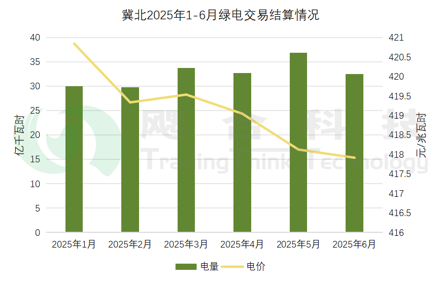 冀北地區(qū)2025年1-6月綠電結(jié)算電量196.01億千瓦時,結(jié)算均價419.09元/兆瓦時。