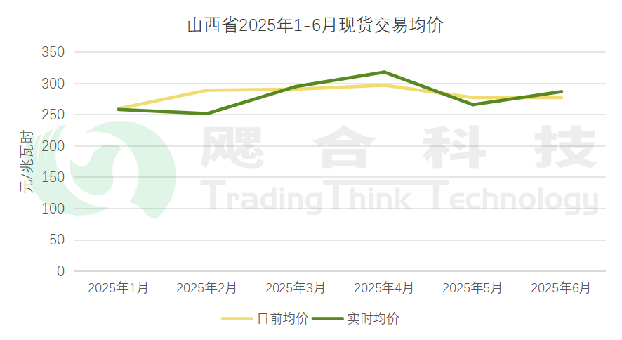 2025年1-6月,山西省現(xiàn)貨日前均價281.93元/兆瓦時,實時均價279.51元/兆瓦時。