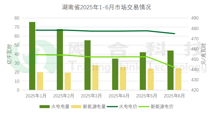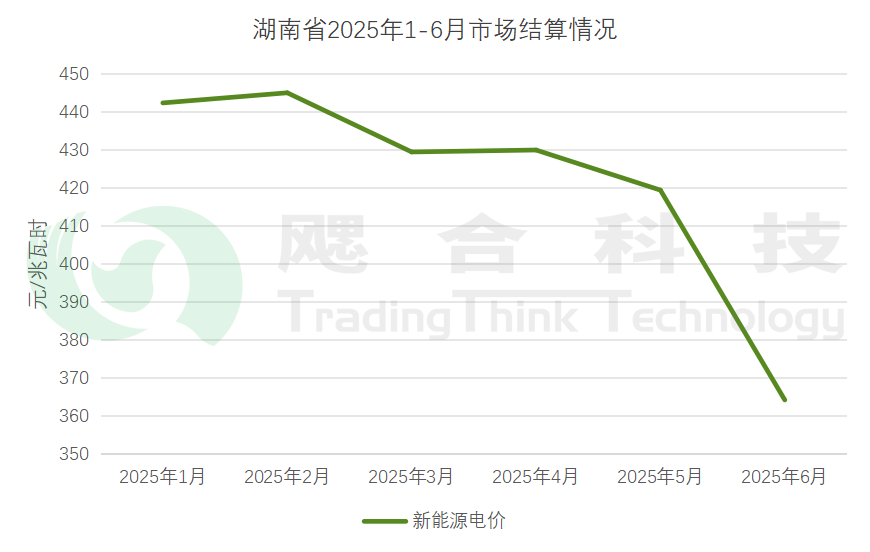 2025年1-6月,湖南省內(nèi)市場累計交易電量461.29億千瓦時,其中火電交易電量320.48億千瓦時,交易均價477.53元/兆瓦時;新能源交易電量140.81億千瓦時,交易均價451.2元/兆瓦時。2025年1-6月新能源累計結(jié)算均價433.71元/兆瓦時,6月結(jié)算價格開展了現(xiàn)貨連續(xù)結(jié)算試運行,新能源結(jié)算價格有較大跌幅。