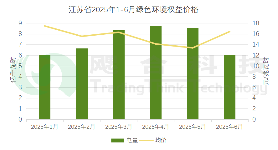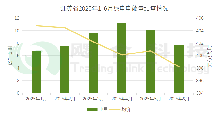 2025年1-6月,江蘇省內(nèi)綠電電能量結(jié)算均價401.55元/兆瓦時,綠色環(huán)境權(quán)益均價15.38元/兆瓦時。6月江蘇開展現(xiàn)貨結(jié)算試運行,綠電電能量價格有較大幅度降低。