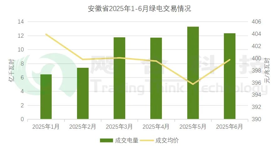 2025年1-6月,安徽省綠電共計成交電量62.97億千瓦時,成交均價399.37元/兆瓦時。