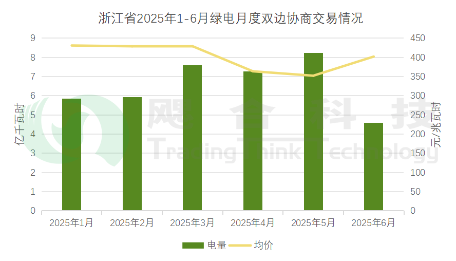 2025年1-6月,浙江省綠電月度雙邊協(xié)商共計成交電量39.5億千瓦時,均價398.16元/兆瓦時,綠電月度摘掛牌共計成交電量0.52億千瓦時,均價419.88元/兆瓦時。