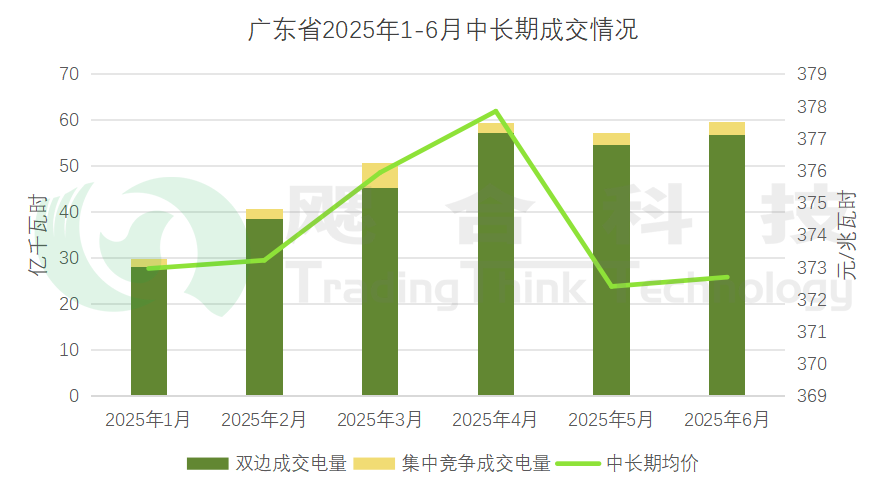 2025年1-6月廣東月度中長期交易綜合價格374.32元/兆瓦時,其中月度雙邊協(xié)商成交電量共280.32億千瓦時,成交均價為373.84元/兆瓦時;月度集中競爭成交電量為17.1億千瓦時,成交均價為382.31元/兆瓦時。