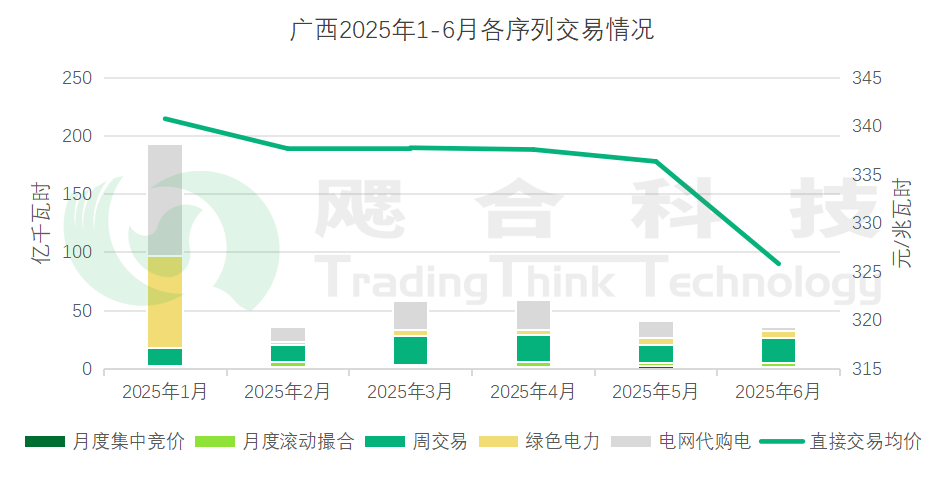 2025年1-6月,區(qū)內(nèi)累計直接交易成交電量1126.18億千瓦時,平均成交價格340.19元/兆瓦時,較燃煤基準上網(wǎng)電價下降80.51元/兆瓦時;其中用戶直接交易電量949.38億千瓦時,平均成交價格340.35元/兆瓦時;電網(wǎng)企業(yè)代理購電交易電量176.80億千瓦時,平均成交價格339.33元/兆瓦時??缡】鐓^(qū)交易成交電量11.78億千瓦時,平均成交價格326.83元/兆瓦時。