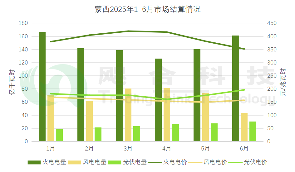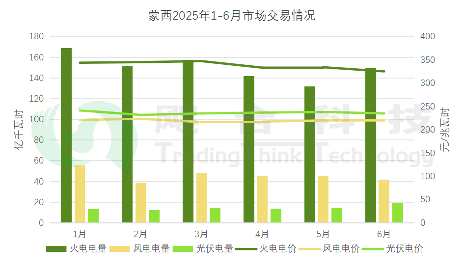 蒙西2025年1-6月累計交易電量1206.18億千瓦時,其中火電交易電量899.99億千瓦時,交易均價338.4元/兆瓦時;風電交易電量275.4億千瓦時,交易均價219.6元/兆瓦時;光伏交易電量86.59億千瓦時,交易均價236.2元/兆瓦時。